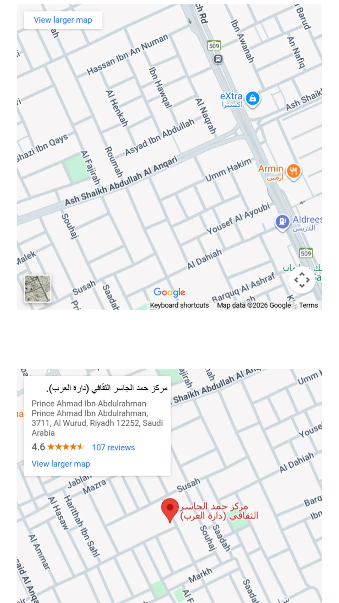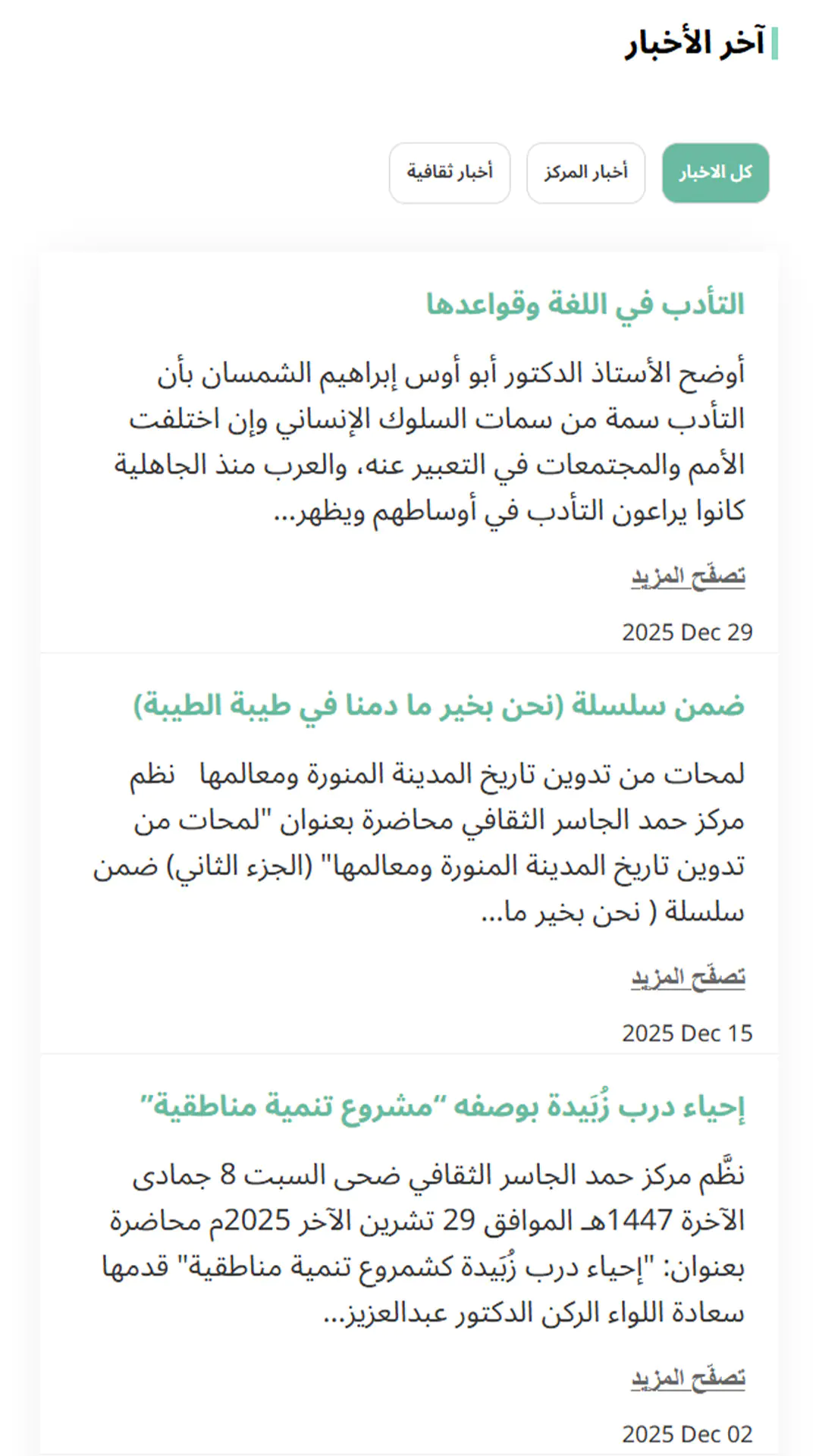 - Cultural Center Overview: Informational sections highlighting the mission, activities, and initiatives of the Hamad Al Jasser Cultural Center.