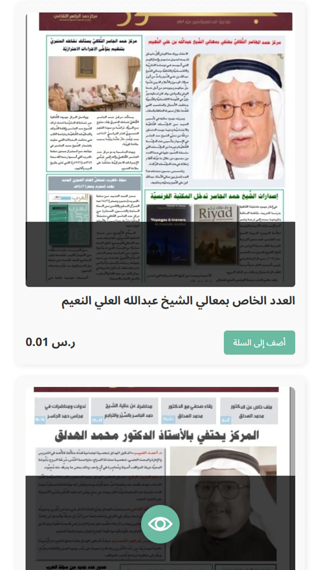 - Publications Library: A digital catalog showcasing magazines and publications associated with the Hamad Al Jasser legacy, including Al-Arab magazine.